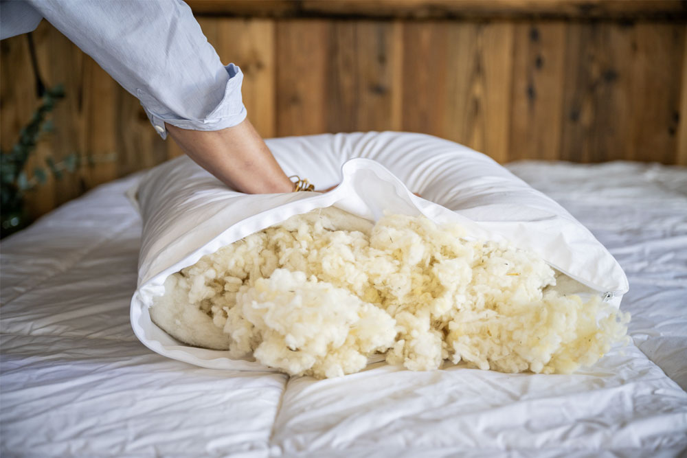 L’ouverture permet également de redonner du gonflant à la laine en la manipulant simplement entre les mains : un geste simple qui réveille les fibres et prolonge la vie de l’oreiller.